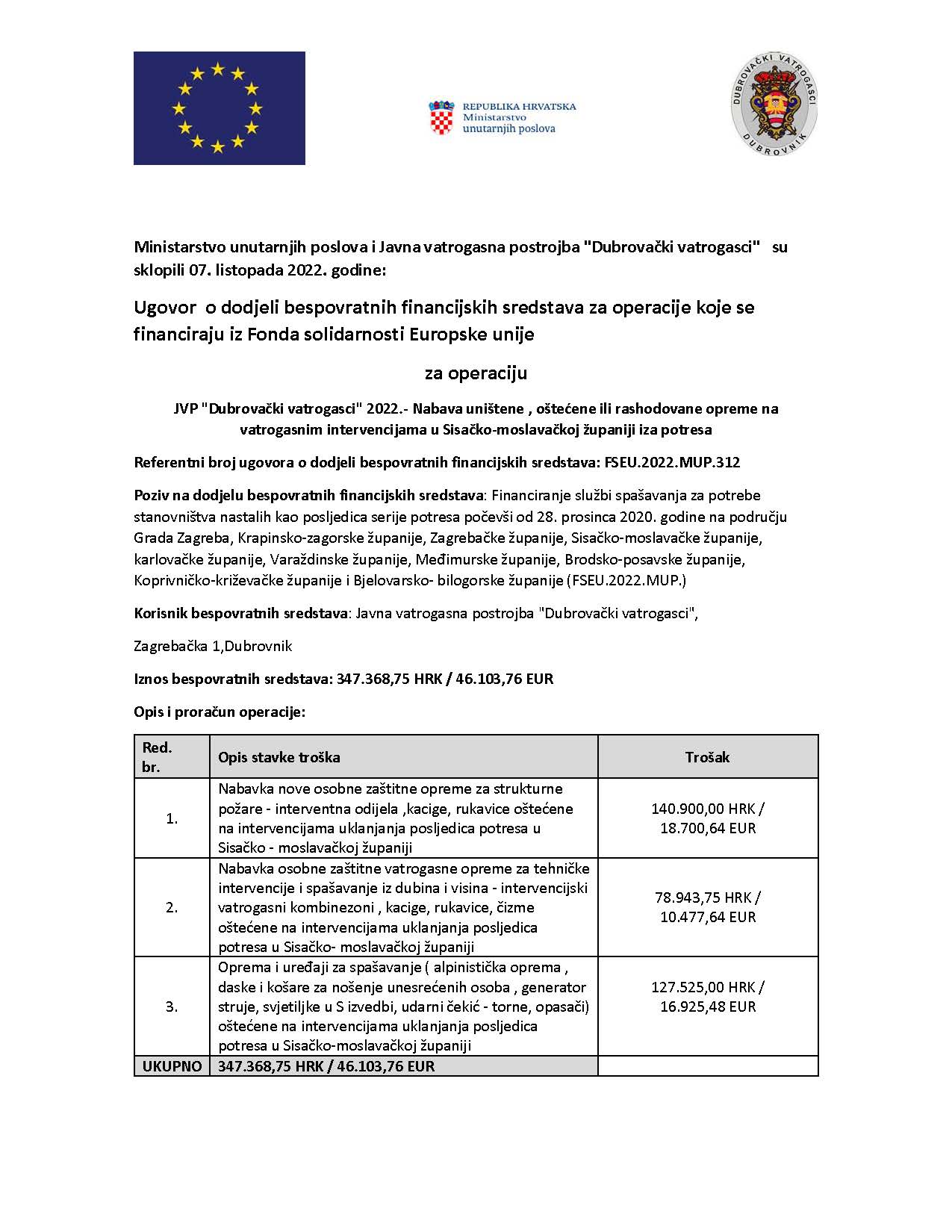 JVP "Dubrovački vatrogasci" sudjelovala je u operaciji pod nazivom "Nabava uništene, oštećene ili rashodovane opreme na vatrogasnim intervencijama u Sisačko-moslavačkoj županiji iza potresa" koja je financirana iz Fonda solidarnosti Europske unije. Na taj način nabavili smo opremu i uređaje u vrijednosti 347.368,75 HRK / 46.103,76 EUR.